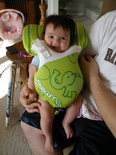 She handled the ride like a champ and actually slept most of the way. She was grumpy when she realized that she had to stay in her life vest the whole time we were on the boat. Since she is so tiny, her life vest is really big on her and kind of looks like the green giant is eating her.