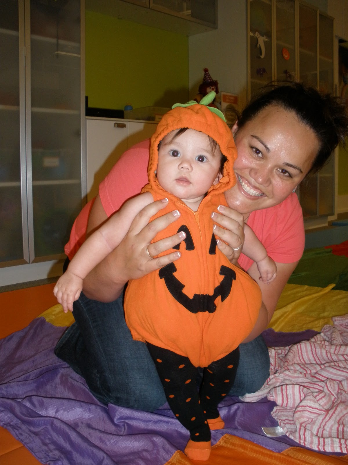 This week at our Gymboree class, to celebrate Halloween, all the babies wore their Halloween costumes! To nobody’s surprise, Ke’alohi was the most adorable pumpkin out there. She rocked her tights and costume like it was her job!