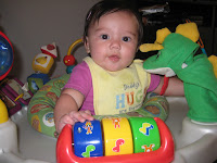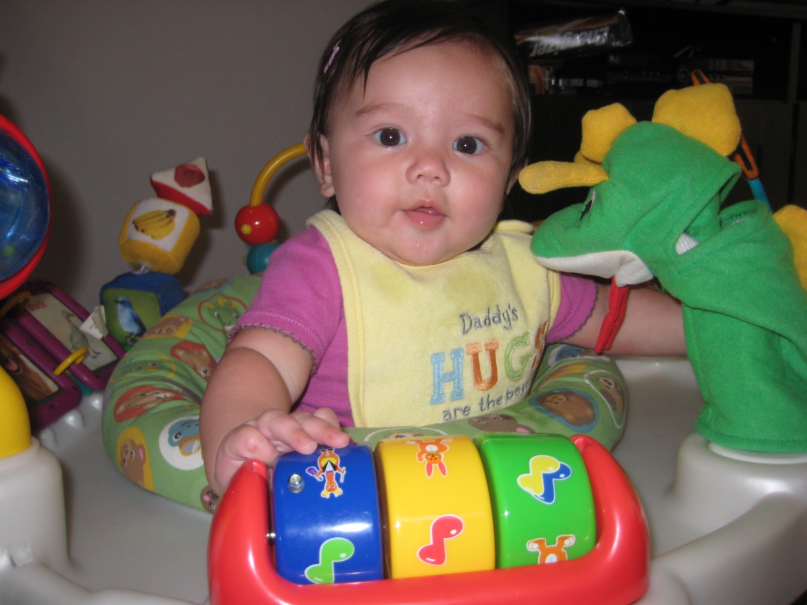 Yesterday we picked up Ke’alohi a Baby Einstein exersaucer and she loves it! Her bouncer with the toy bar just isn’t cutting it anymore for other than a few minutes at a time and for feeding her. We knew that she needed something that stimulated her more and could really grab and keep her attention.