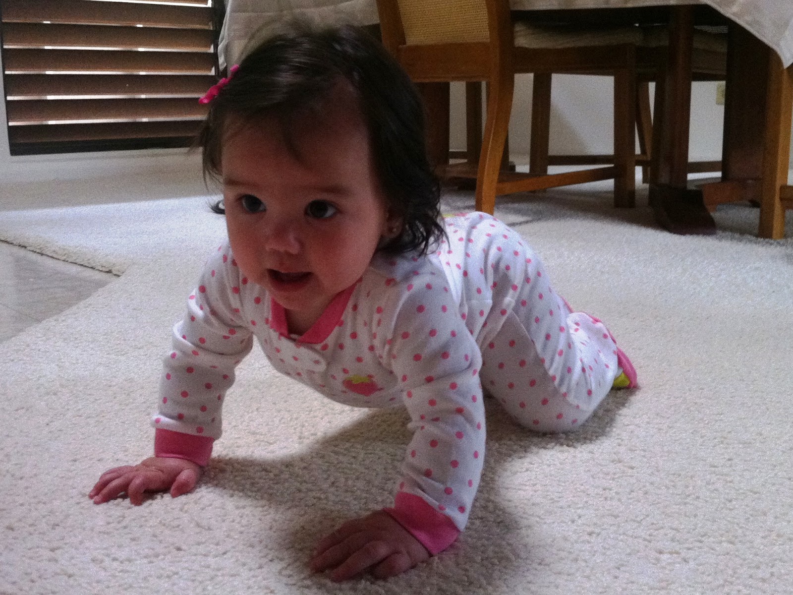 This girl is going to make me go crazy constantly updating the blog with all the new things she is doing. I have already around 40 posts just for December! We have all been wanting to see her crawl for days now and she has been so close. Today when Lucas and I were packing and Puna was playing with Ke’alohi, she started to have this determined look on her face. My mom instantly knew she was going to do it right then and there. She grabbed her camera and called us all around Ke’alohi and we all got to witness Ke’alohi crawling for the first time.