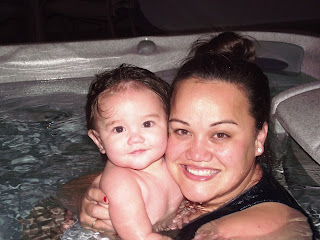 We have a hot tub outside on our deck so this year my dad put up the Christmas lights around it so that when we went in at night the deck would be lighted.  Since our attempts at the beach failed this trip, I really wanted to take Ke’alohi into the hot tub so that she could go swimming and float around.  She is such a water baby and loved it from the moment I brought her in.  She splashed to her heart’s content and loved it.